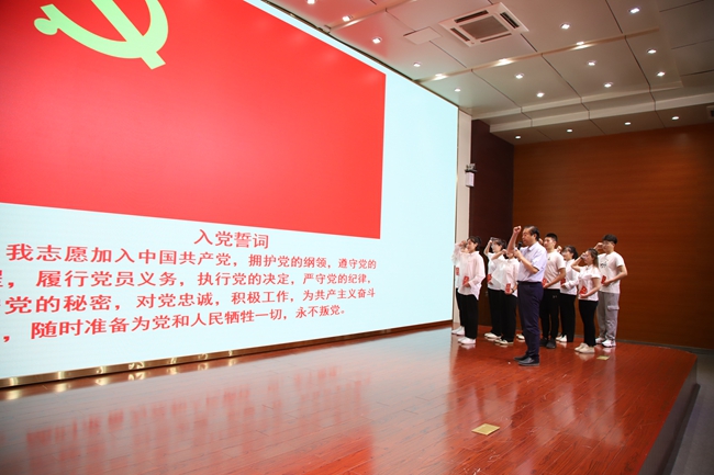 宣誓活动在雄壮的《国际歌》声中正式启动。顾强同志带领173名新党员代表面对鲜红的中国共产党党旗庄严宣誓,其他同志重温入党誓词,铿锵有力的宣誓声响彻大厅。