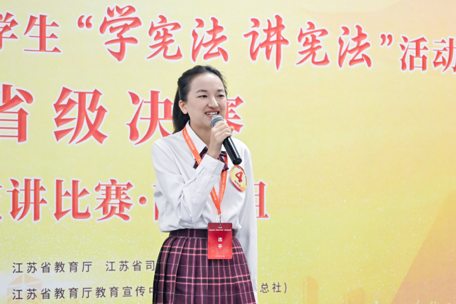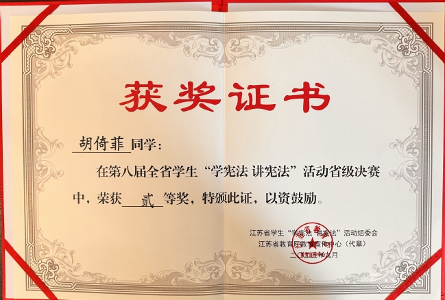 9月23-9月24日,由省教育厅、省司法厅主办的第八届全省学生“学宪法 讲宪法”演讲比赛省级决赛在南京举行,我校学前教育学院(音乐学院)胡倚菲同学荣获二等奖。