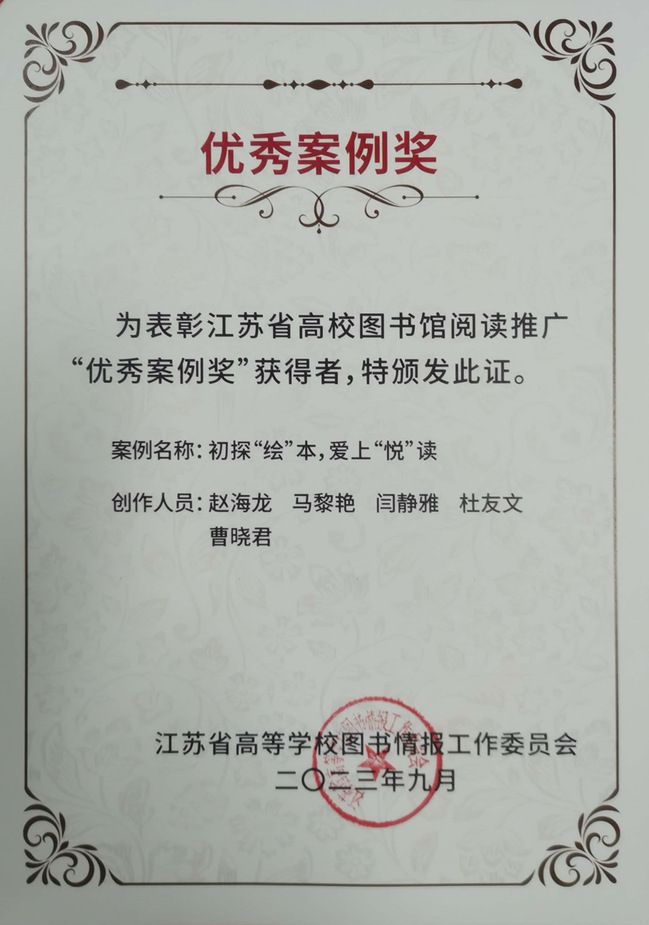 日前,江苏省高等学校图书情报工作委员会公布了2023年江苏省高校图书馆阅读推广工作优秀案例征集活动评选结果。我校图书馆申报的《初探“绘”本,爱上“悦”读》项目荣获江苏省高校图书馆阅读推广优秀案例奖,副馆长马黎艳获江苏省高校图书馆阅读推广优秀馆员称号。