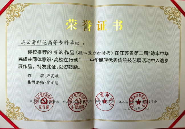 近日,由江苏省民宗委、省委宣传部、省委统战部、省教育厅主办,苏州大学承办的江苏省第二届“铸牢中华民族共同体意识·高校在行动”铸牢中华民族共同体意识知识竞赛决赛暨总结大会落下帷幕。由我校美术学院廖文慧老师指导,22环境艺术设计班严高敏同学创作的剪纸作品《凝心聚力新时代》入选江苏省第二届“铸牢中华民族共同体意识·高校在行动”——中华民族优秀传统技艺展活动参展作品。